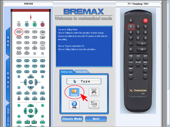 Selecting the defining RC then under the customized mode, on the left side will display BREMAX URC and on the right side is your original RC. You can click the buttons of the original RC which you want to redefine and click the free buttons of BREMAX URC and click "defining" as below figure: